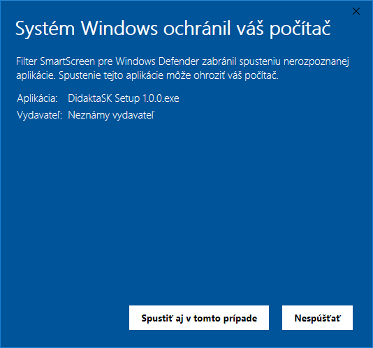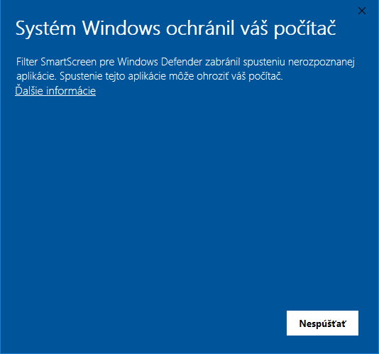 Po spustení inštalačného súboru sa môže objaviť oznámenie SmartScreen filtra programu Windows Defender - viď obrázok: