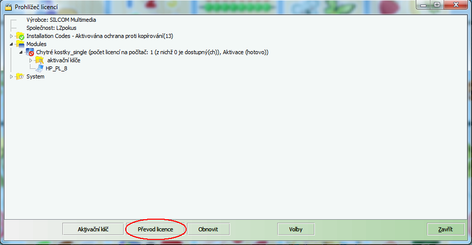 - Stlačte tlačidlo Prevod licencie (pozri obrázok) a potom postupujte podľa pokynov na obrazovke.
