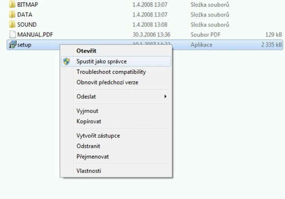 Najčastejšou príčinou problémov sú administrátorské práva pre inštaláciu. Ak má používateľ administrátorský účet (čo je podmienkou pre inštaláciu programov), pri zapnutom Riadení užívateľských účtov (UAC) odporúčame inštalovať programy kliknutím na súbor setup.exe pravým tlačidlom myši a potom výberom možnosti Spustiť ako správca – viď obrázok: