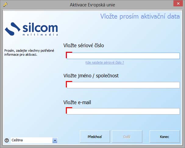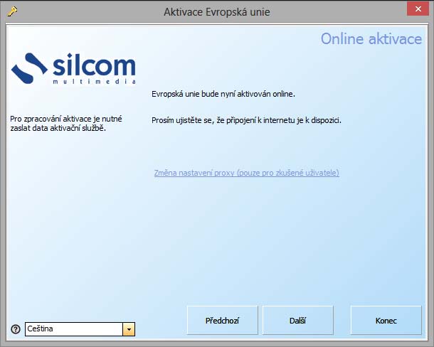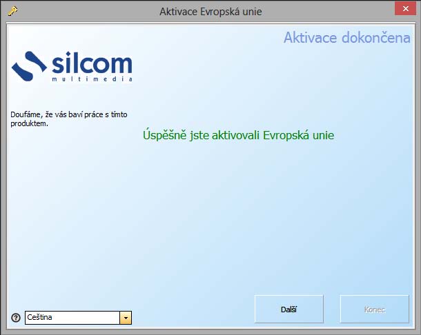 Ak ste vložili správne sériové číslo a uskutočnila sa online aktivácia, úspešne ste zaktivovali produkt.. Kliknutím na tlačidlo "Další" je proces aktivácie skončený a automaticky sa spustí program.Aktiváciu je potrebné uskutočniť iba raz na jednej pracovnej stanici - na ďalších staniciach v sieti sa po kliknutí na zástupcu hneď spustí program.